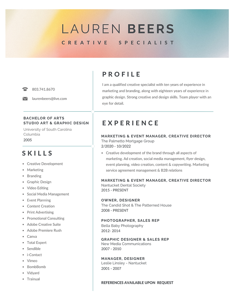 I am creative specialist with over twenty years of experience in all aspects of design. I have dabbled in everything from crafts & furniture restoration to professional photography & jewelry design. I have over 15 years of professional experience in graphic design, sales/marketing, branding, and social media. I possess incredibly strong creative and design skills, and an eye for detail. I am a team player with impecible communication skills, business acumen, and am results driven with experience leading project teams.